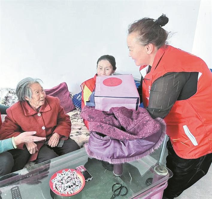齐齐格(右)给社区老人送生活用品(资料图片)。本人提供