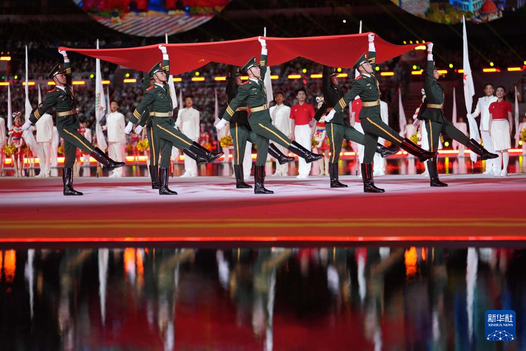 11月9日,旗手护送中华人民共和国国旗入场。当日,第十五届全国运动会开幕式在广东奥林匹克体育中心举行。新华社记者 杨冠宇 摄