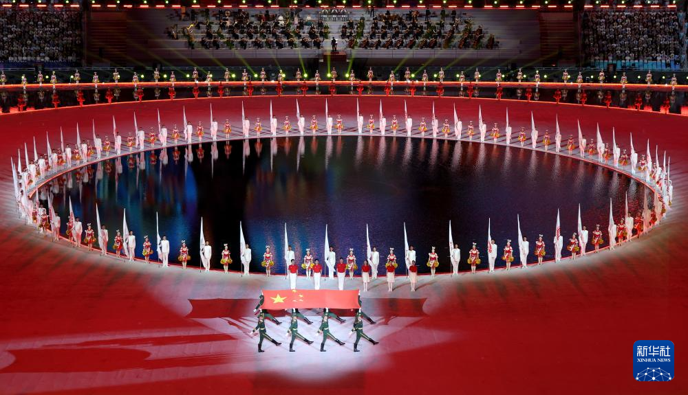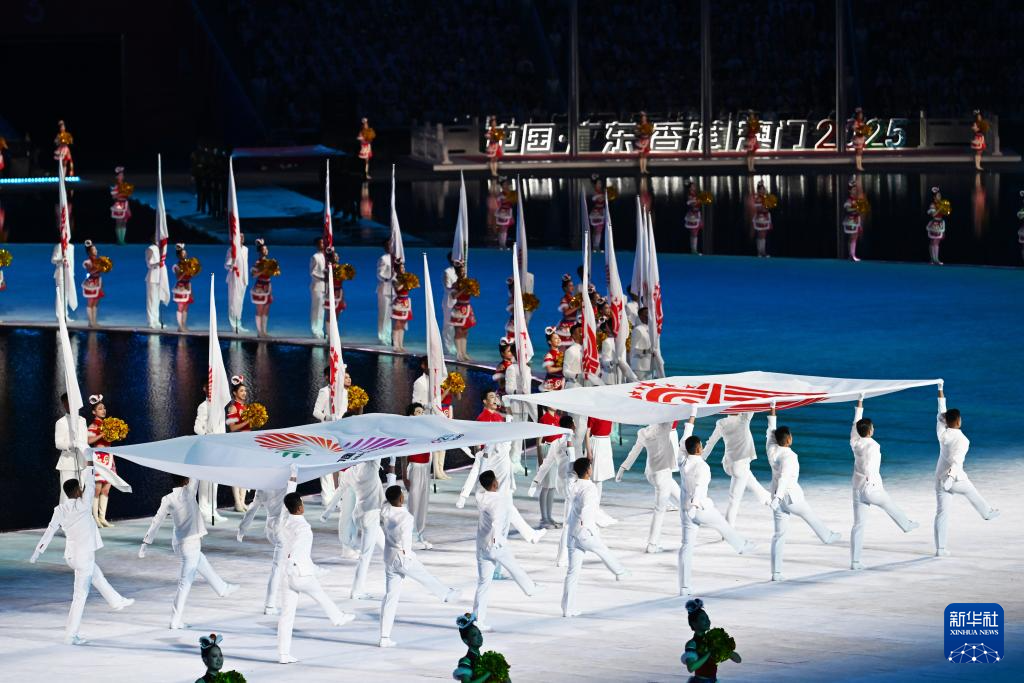 11月9日,旗手护送中华人民共和国运动会会旗和第十五届全国运动会会旗入场。当日,第十五届全国运动会开幕式在广东奥林匹克体育中心举行。新华社记者 杨冠宇 摄