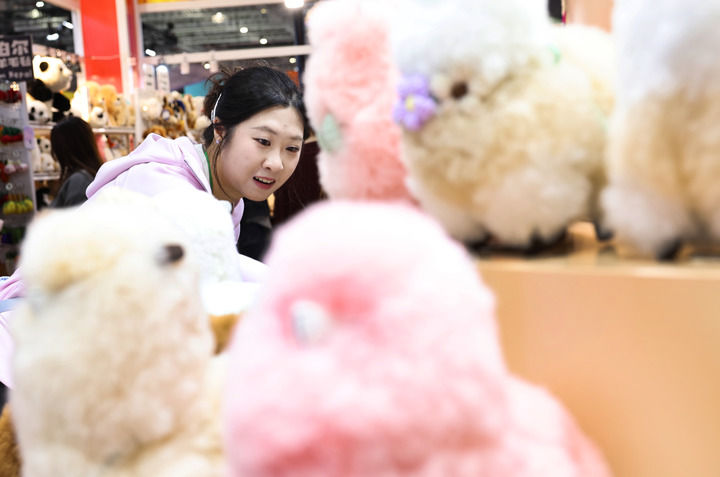 2025年11月8日,在第八届进博会消费品展区,参观者在秘鲁温暖驼品牌的羊驼毛制品前驻足观看。新华社记者 方喆 摄