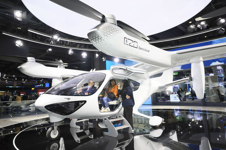 2025年11月8日,人们在第八届进博会汽车及智慧出行展区时的科技展位体验电动垂直起降飞行器。新华社记者 王翔 摄