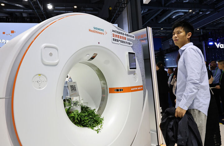 2025年11月6日,参观者在进博会西门子公司展台一个CT机展品旁驻足观看,这是西门子公司首款国产双源光子计数CT,也是该产品亚洲首发首展。新华社记者 方喆 摄