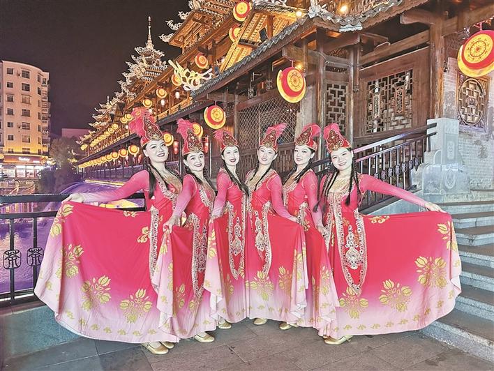 开幕式后,“一河三域·灯火共歌”荆楚民俗文化与民歌巡游精彩上演。沿宣恩县人民路至丹峰广场的巡游路线,五师双河市舞蹈演员带来的歌伴舞《美丽新疆》,成为巡游队伍中一道亮眼的风景线。欢快的旋律随风飘扬,演员们迈着轻快的舞步,边表演边与沿途游客热情互动,递上兵团特色的小礼品,邀请游客随节奏共舞。游客们纷纷驻足,或拍摄视频,或跟着哼唱,或合影留念,现场气氛热烈温馨。