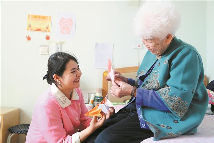 六师五家渠市吾家乐宝养老总院护理员陪老人做手工(摄于11月8日)。兵团日报常驻记者 任斐斐 通讯员 朱小丽 摄
