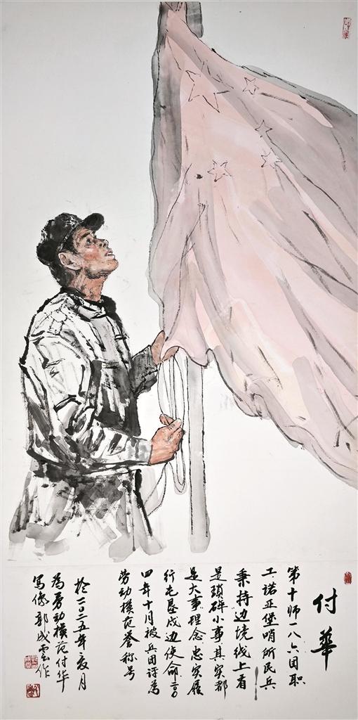 付华 郭成云 绘 作品简介:付华,十师一八六团退休职工,曾是诺亚堡哨所民兵,因数十年如一日地忠实履行屯垦戍边使命,2004年被评为兵团劳动模范,2010年被评为全国边海防工作先进个人。