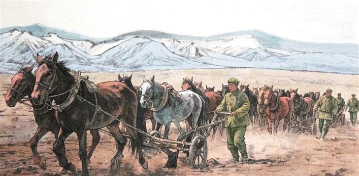 巴里巴盖第一犁 尤山 绘 作品介绍:1952年4月1日,军垦战士以军马拉犁,在巴里巴盖(现十师一八一团所在地)开启首次垦荒生产。