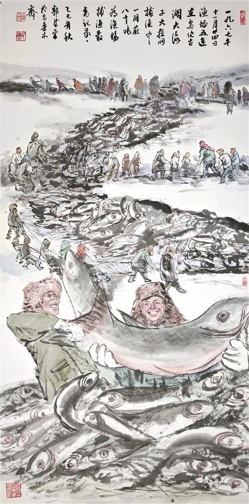 一网80吨鱼 郭成云 绘 作品介绍:1967年11月24日,农十师渔场五连(现十师一八八团五连)职工在乌伦古湖大海子拉大网捕鱼,一网捕获80吨鱼,创当时渔场最高纪录。