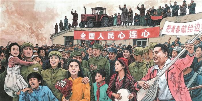 慰问二十八团 尤山 绘 作品介绍:1954年4月,全国人民慰问解放军代表团来到农十师二十八团(现十师一八一团),全团欢声笑语、气氛热烈。