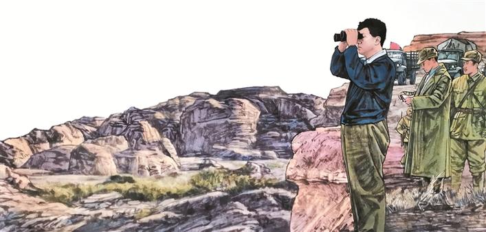 张仲瀚勘察定点 尤山 绘 作品介绍:1958年8月,时任兵团副政委的张仲瀚登顶得仁山,为即将组建的农十师(现十师北屯市)师部选址,将师部驻地命名为“北屯”,寓意最北边的一支屯垦部队。