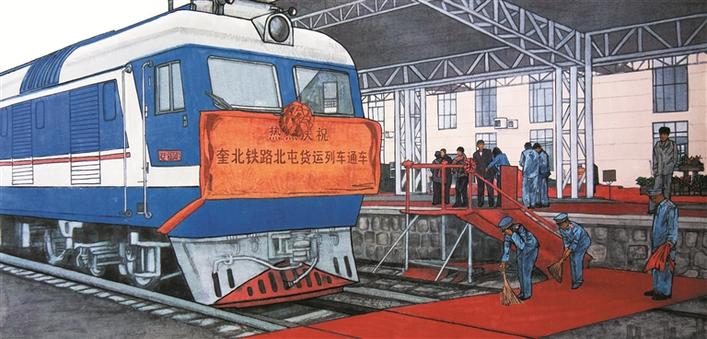 奎北铁路通车 张艺 绘 作品介绍:2011年4月18日,奎北铁路北屯货运列车开通运营。