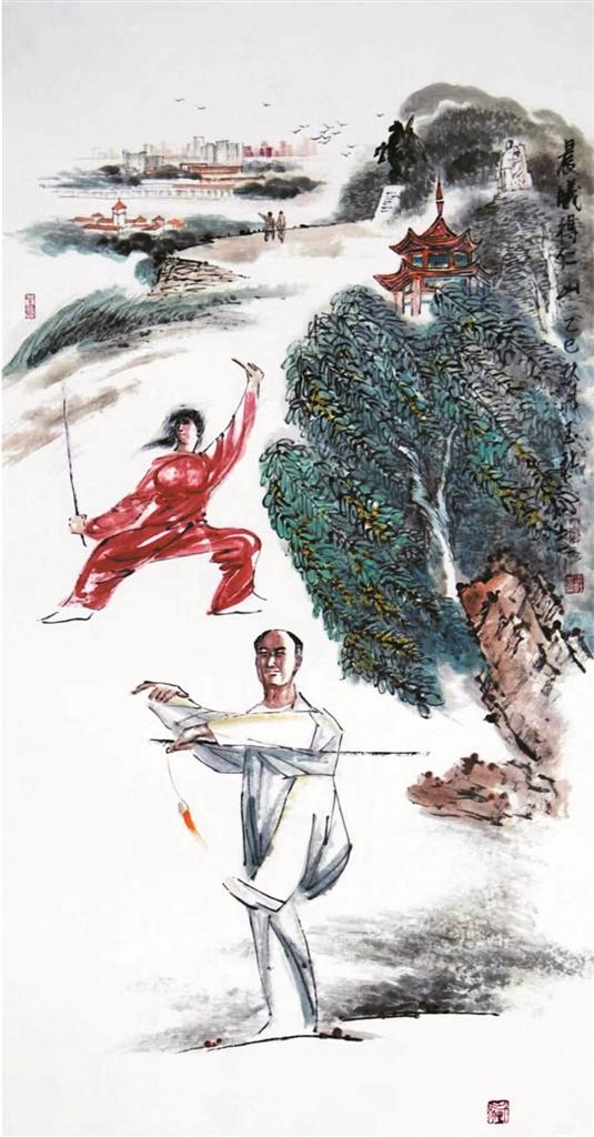 晨曦得仁山 刘玉社 绘 作品介绍:得仁山公园位于北屯市中心,东西绵延3.7公里,总面积约1100公顷,山上绿化面积逾800公顷,被誉为“城市绿肺”。