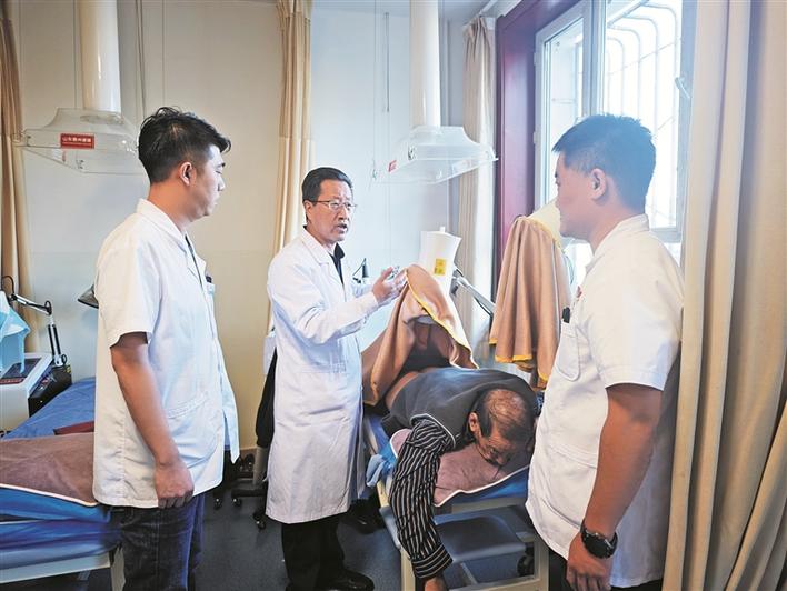 10月28日,在十二师五一农场医院中医科理疗室,陶生学(中)在为徒弟讲解针灸技巧。兵团日报常驻记者 冯晓玲 摄