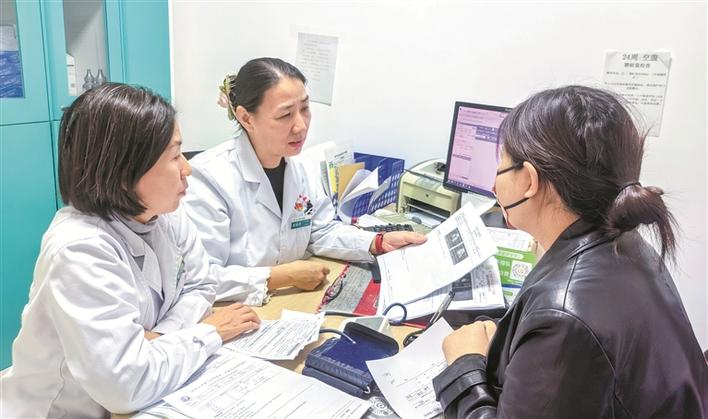 11月13日,在二师库尔勒医院产科门诊,黄艳卉(中)为前来就医的孕妇讲解孕期注意事项和科学养胎方法。兵团日报常驻记者 李嘉成 摄