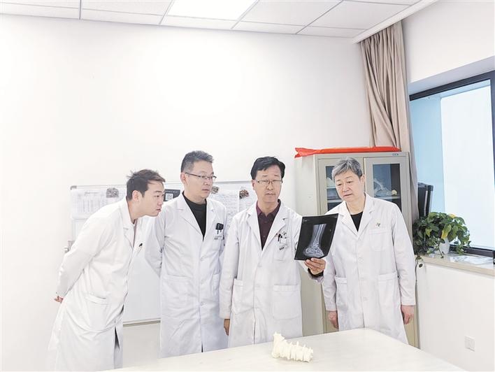 盛文辉(右二)带领脊柱外科骨干团队查阅X光片(资料图片)。侯道静 摄