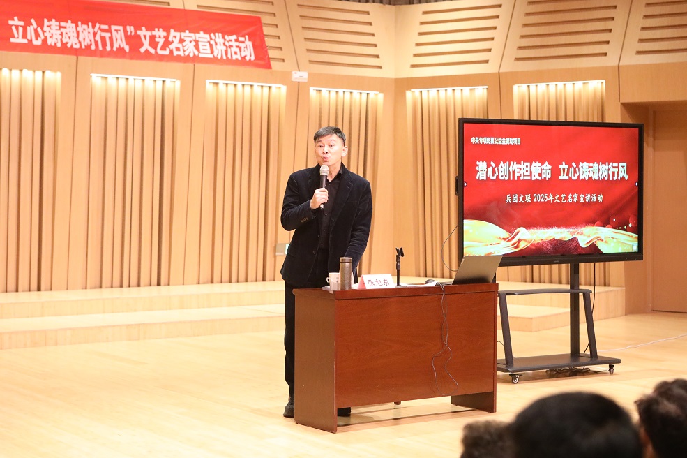 首位宣讲嘉宾为中国曲艺家协会副主席张旭东,他以《深学全会精神守正创新铸魂——以党的二十届四中全会精神引领文艺(曲艺)事业高质量发展》为题,系统分享曲艺发展路径。他强调要将使命任务融入曲艺创作、表演、传播全过程,突出数字时代传播重要性,坚持党的领导、对标“十五五”部署,扎根生活创精品,用通俗的表达方式让政策主张深入人心。作为四川省非遗(谐剧)传承人,张旭东曾获“德艺双馨文艺工作者”、中国曲艺“牡丹奖”等殊荣,其多年来的文艺创作心路历程,让现场听众深刻感受文艺工作者的使命担当。