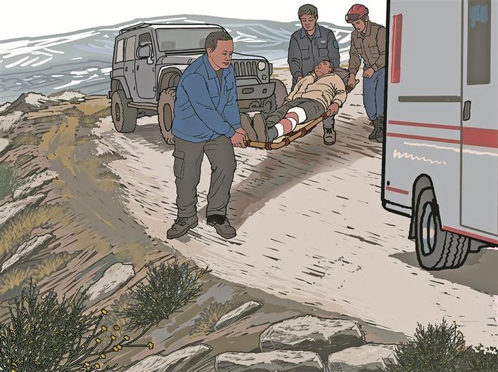 ⑧2019年8月27日,程孝军驾车在独库公路途中,遇到一个由7辆摩托车组成的车队。在铁力买提达坂拐弯处,一辆摩托车滚下了山坡,他立即从车上拿出救援绳和救援专用铲,投入救援。最终,伤者被成功救起,送往医院。