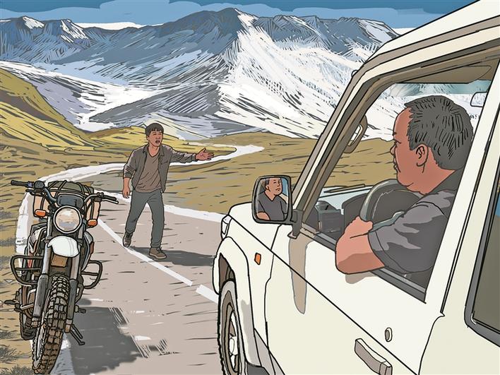 ⑥2015年5月初,程孝军开车行驶在新藏线上,途中看到路边有一个小伙子在拦车寻求帮助。他停下车后,小伙子看着他激动地说:“我认识您,叔叔!”见程孝军没想起来,他又说:“去年您参加云南地震救援的时候,我也在啊!想起来了吗?”瞬间,程孝军想起那个文弱稚嫩的大学生志愿者。