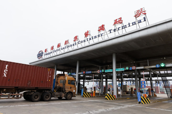 在位于儋州市的洋浦国际集装箱码头,货车在进行“二线口岸”压力测试演练(2025年12月11日摄)。新华社记者金立旺摄