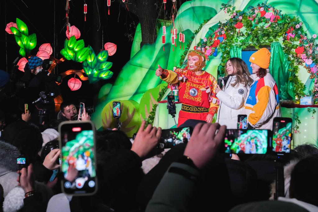 12月17日,外国媒体记者在长春市动植物公园与西游记主题表演演职人员进行互动。新华社记者许畅摄