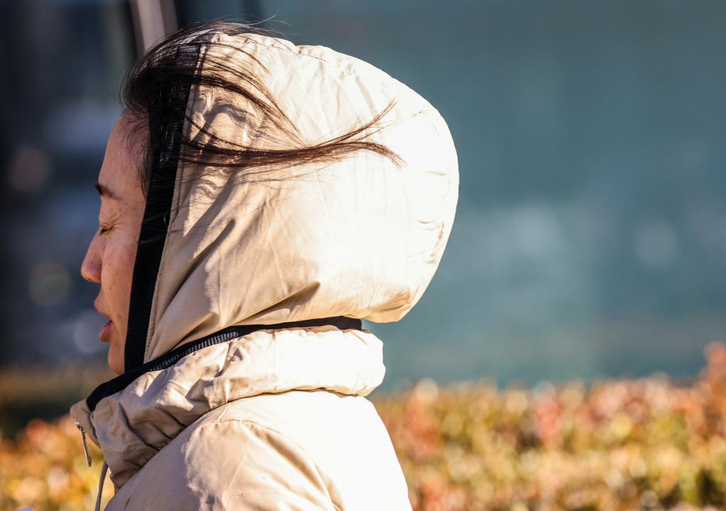 12月2日,在北京市西城区,一名路人被风吹得闭上了眼睛。新华社记者殷刚摄