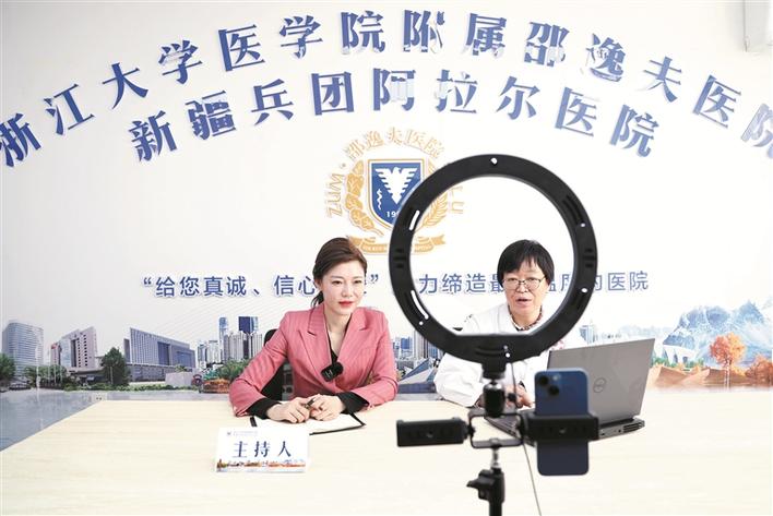 在浙大邵逸夫阿拉尔医院网络直播间,医生在线向网友普及医疗保健知识(资料图片)。随着兵团国家区域医疗中心建设稳步推进,浙大邵逸夫阿拉尔医院充分利用“互联网+医疗”模式,让优质医疗服务“多跑腿”、职工群众“少跑路”,持续增强区域医疗服务能力。兵团日报全媒体记者 王志清 摄