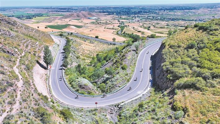 “向阳而生 向山而行”奇台农场首届一万泉公路自行车挑战赛在奇台农场一万泉景区鸣笛开赛。来自全国各地近300名选手进行激烈的角逐,骑手们在山间骑行(摄于6月29日)。兵团日报常驻记者 李华北 摄
