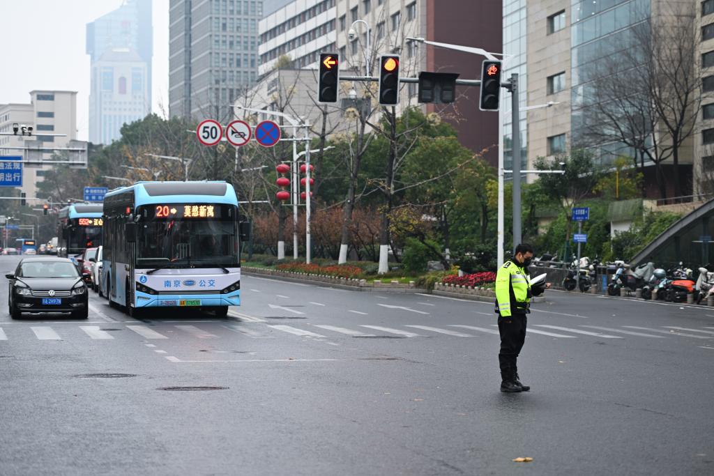 2025年12月13日,南京交警在街头默哀。新华社发(杨素平摄)