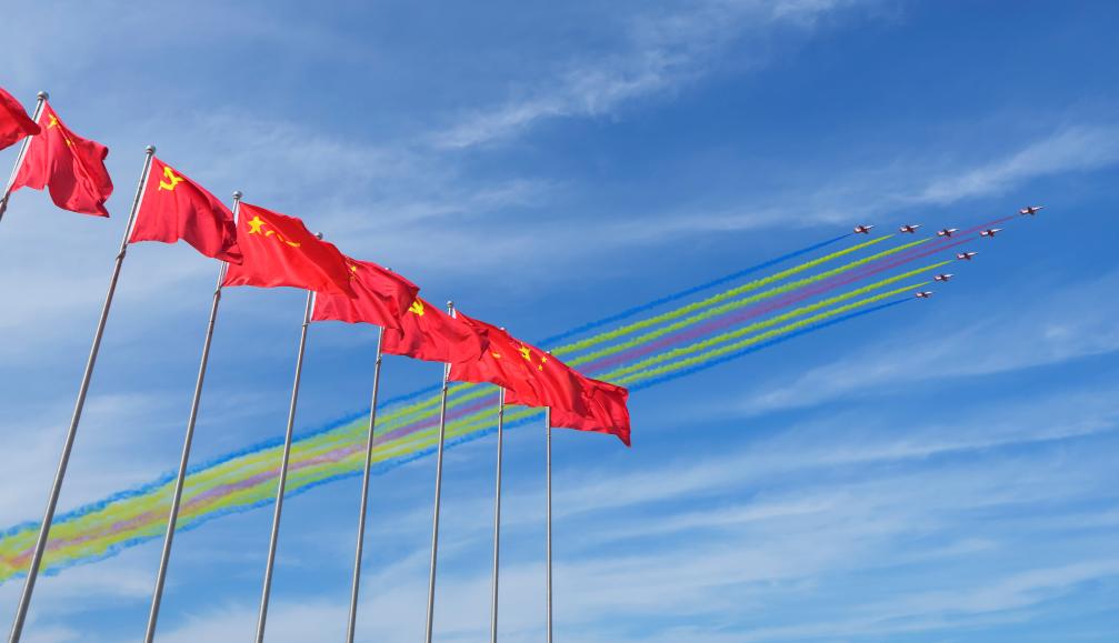 2025年9月3日,纪念中国人民抗日战争暨世界反法西斯战争胜利80周年大会在北京隆重举行。这是观众拍摄空中护旗梯队通过天安门广场。新华社记者 李安 摄