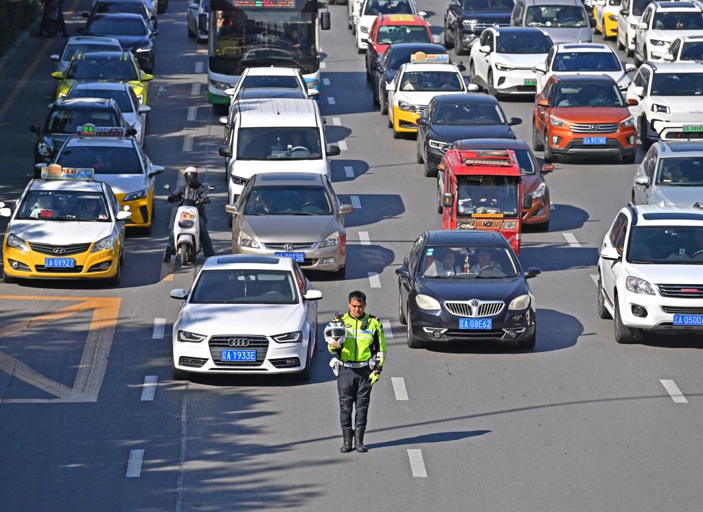 2025年9月18日,交警在沈阳崇山中路脱帽伫立。新华社记者 周华 摄