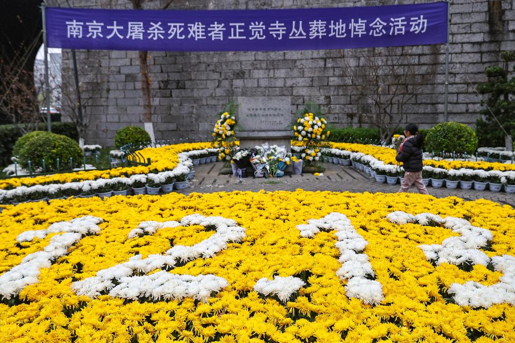 2025年12月13日,一名小朋友在位于江苏南京的侵华日军南京大屠杀死难同胞丛葬地(正觉寺)参加悼念活动。新华社发(辛一摄)