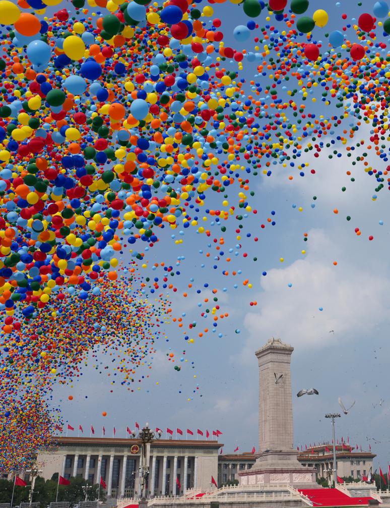2025年9月3日,纪念中国人民抗日战争暨世界反法西斯战争胜利80周年大会在北京隆重举行。这是纪念大会现场放飞气球。新华社记者 李贺 摄