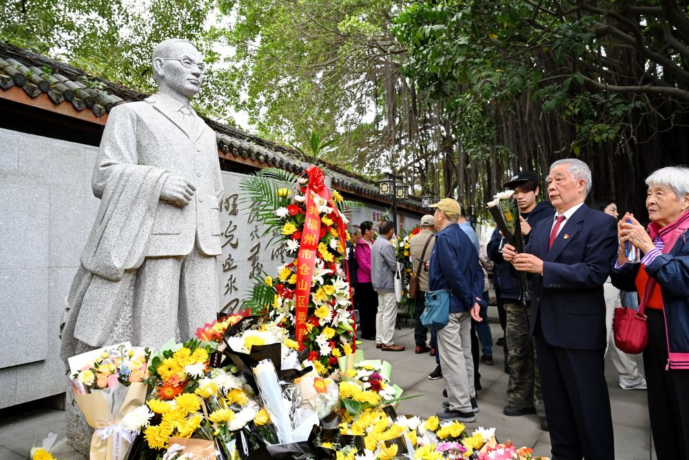 2025年11月6日,在福州市螺洲镇的吴石故居,人们向吴石雕像敬献鲜花表达敬意。新华社记者 林善传 摄