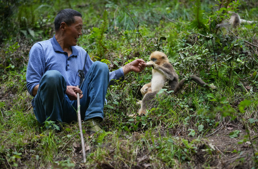 2025年5月21日,在平武川金丝猴科普自然教育基地里,巡护员徐庭友与川金丝猴握手。新华社记者 江宏景 摄
