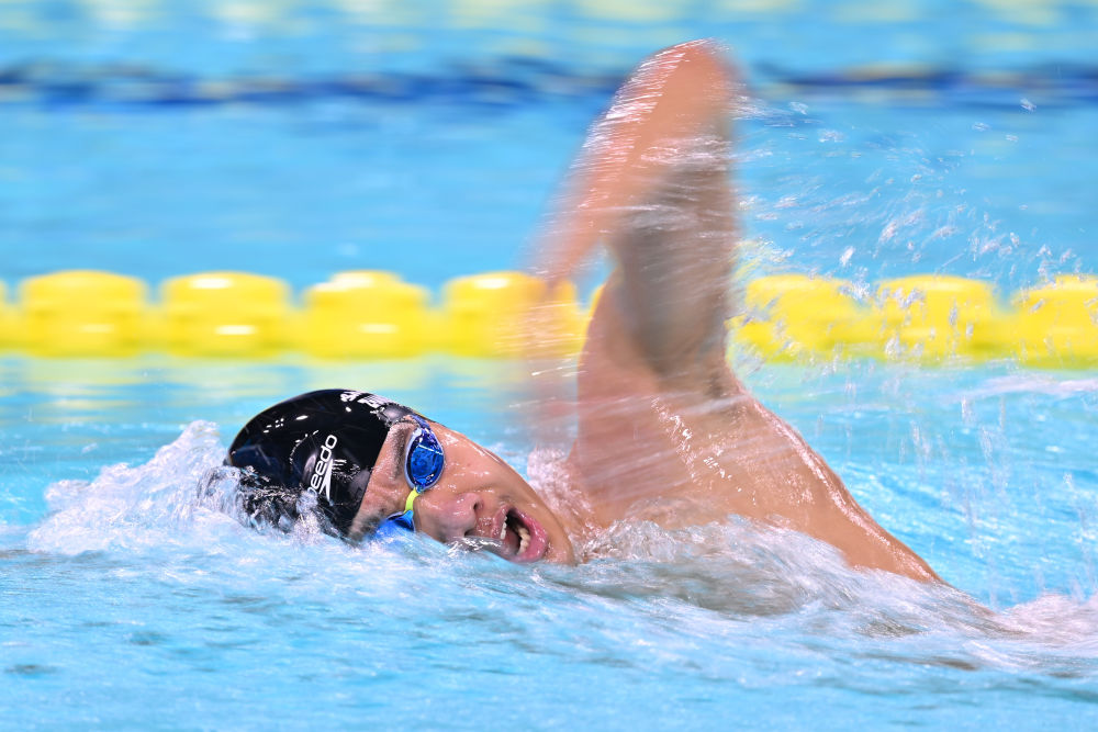 2025年11月17日,山东队选手张展硕在比赛中。他最终获得冠军。当日,第十五届全国运动会游泳男子1500米自由泳决赛在广东省深圳市举行。新华社记者 陈益宸 摄