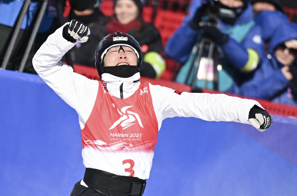 2025年2月9日,徐梦桃庆祝夺冠。当日,在亚布力举行的第九届亚冬会自由式滑雪女子个人空中技巧决赛中,中国选手徐梦桃、陈雪铮包揽冠亚军。新华社记者 夏一方 摄