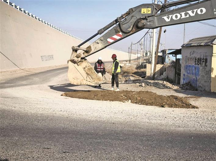兵团建工水电集团市政路桥公司五师双河市G577公路项目党员突击队队员在G30高速与国道208连接线处修复坑洼路面(摄于11月20日)。周建康 摄