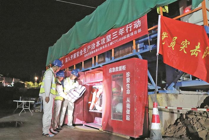 兵团交通建设有限公司苍泰9标项目党员突击队,夜间值守时检查防汛物资(资料图片)。姜珊 摄