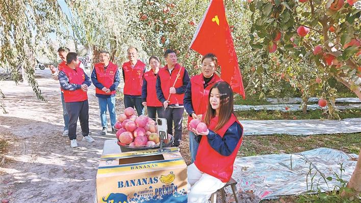 兵团交通建设有限公司喀什地区项目党支部志愿者,利用线上平台帮助种植户销售苹果(摄于10月12日)。十一师融媒体中心 提供