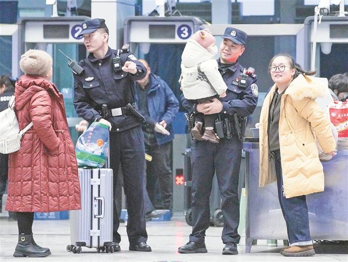 12月28日,乌鲁木齐铁路公安局乌鲁木齐公安处石河子站派出所民警帮助乘客通过安检。兵团日报全媒体记者 陈洋 摄