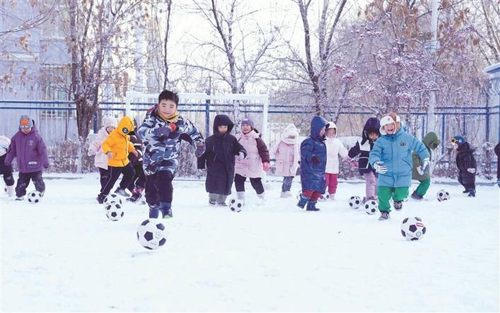 12月21日,十师北屯幼儿园的小朋友在雪地里踢足球。兵团日报常驻记者 李正虎 摄