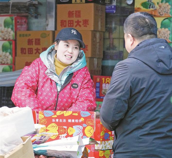 12月21日,新疆九鼎农产品批发市场干果交易中心大厅内,商户为顾客介绍产品。兵团日报全媒体记者 陈洋 摄