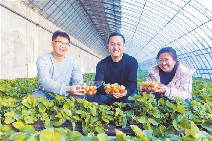 12月25日,二师二十九团园十一连温室大棚里,二师农业科学研究所专业技术人员展示培育的草莓新品种。兵团日报常驻记者 李嘉成 摄