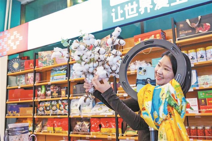 12月23日,五师九〇团职工李慧慧在直播间推介当地特色产品。秦桂连 摄