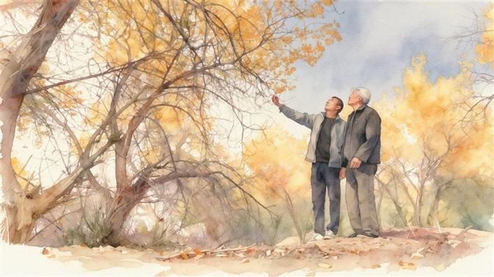 大漠无言,胡杨有根。父亲一辈子扎在这里,我也会继续守护下去,让这片绿色在风沙中生生不息、接续生长。