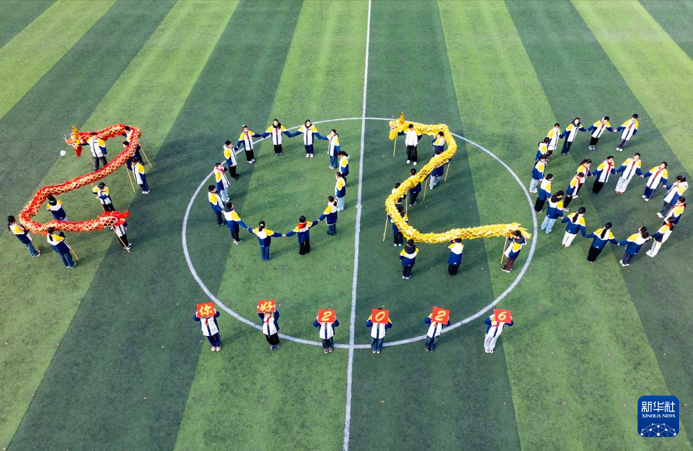 12月31日,江苏省泰州市海陵区九龙实验学校学生在操场上舞龙迎新年(无人机照片)。新华社发(汤德宏摄)