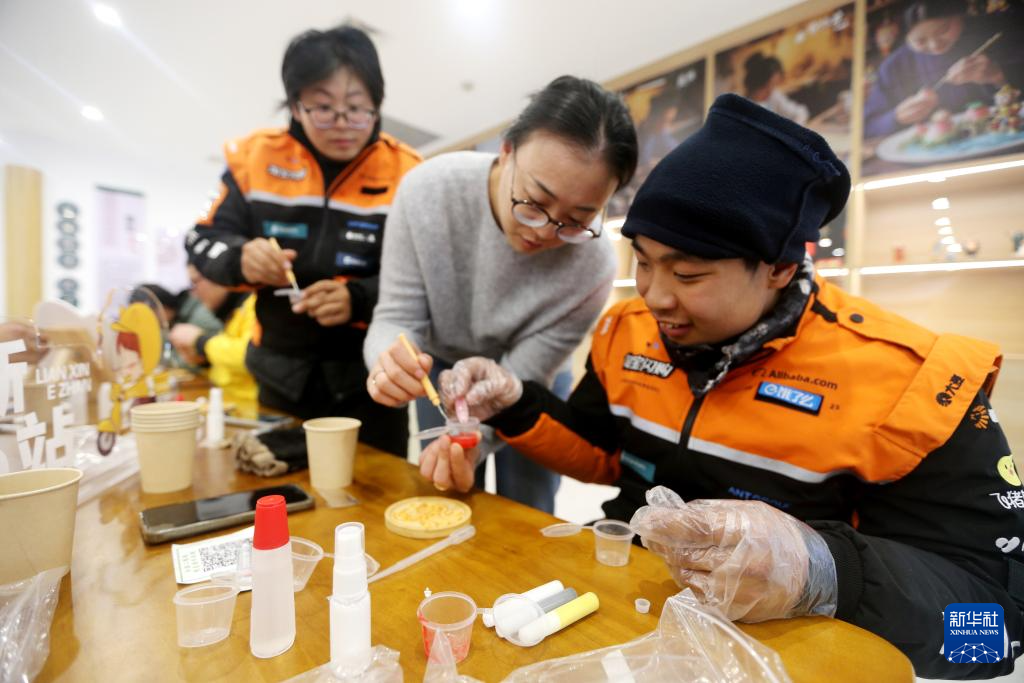 12月30日,在江苏省连云港市连云区墟沟街道南山社区“‘新’手纳百财 非遗迎新年”主题活动中,掐丝工艺师指导快递小哥制作非遗手作。新华社发(王春摄)