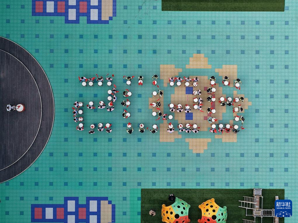 12月30日,在江苏省海安高新区孙庄幼儿园,孩子们在老师指导下进行传统击鼓表演(无人机照片)。新华社发(周强摄)