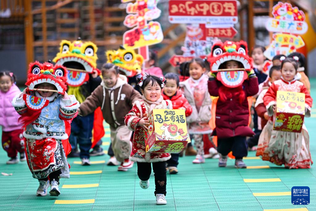 12月31日,江苏南京建邺区金地名京幼儿园的孩子们开展新年祝福活动。新华社发(方东旭摄)