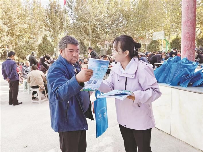 兵团医疗保障局工作人员(右)向群众宣传医保缴费政策(摄于2025年9月30日)。哈丽玛赛金祥 摄