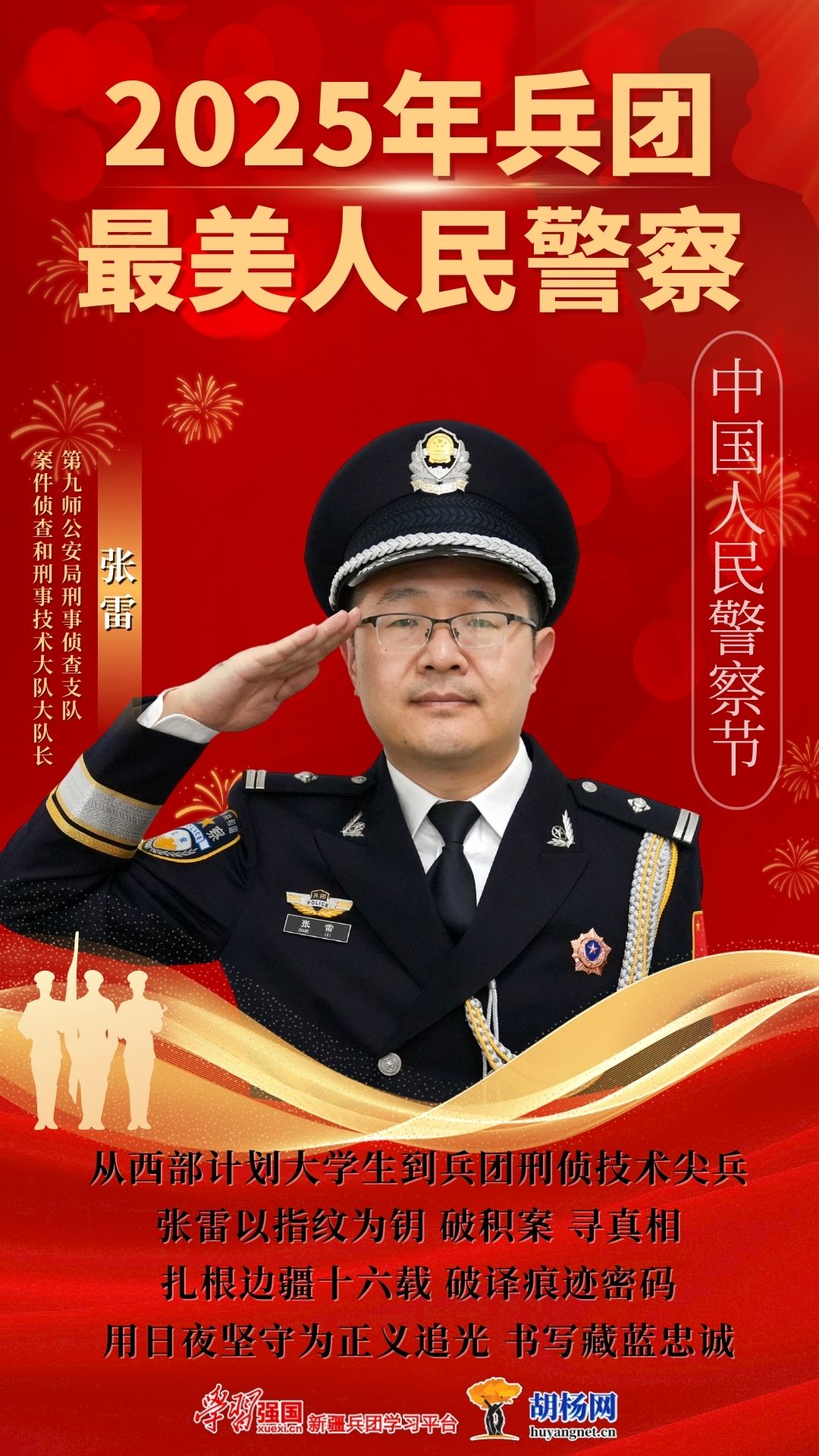 编者按:2025年9月24日,兵团党委宣传部、公安局联合评选揭晓7名兵团“最美人民警察”,他们是兵团公安忠实履职的优秀代表,以坚守与奉献践行使命担当,用实际行动诠释“忠诚如磐、为民似火”的初心,彰显兵团公安队伍正气浩然的良好形象,为实现新疆工作总目标注入坚实力量。在第六个中国人民警察节到来之际,让我们一起回顾2025年评选出的兵团“最美人民警察”的故事。
